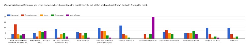 The Survey indicated that word-of-mouth is by far the top lead source (93%) and the most reliable marketing tool across respondents. And yet ~42% would like more leads.
